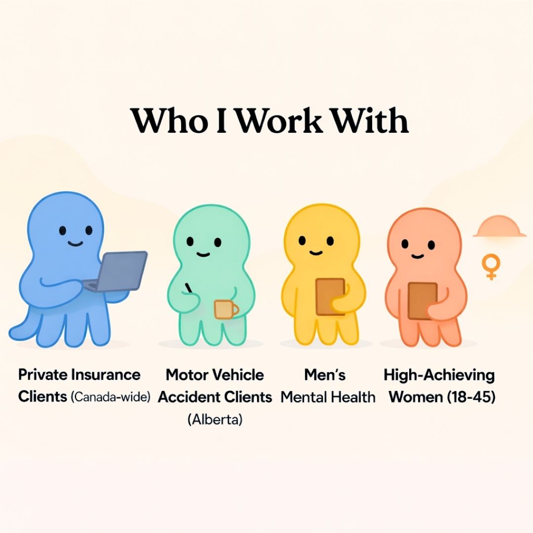 Part of the structured MVA Recovery Program. Specialized online counselling for clients recovering from motor vehicle accidents in Alberta, integrating counselling, hypnotherapy, breathwork, and meditation coaching to support emotional, psychological, and functional recovery. Sessions are billed under counselling designations (CCC, CT) and are often eligible within MVA claim processes.
